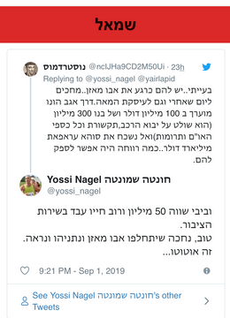 לבסוף, אפשר לבחון מדגם אקראי אך לא מייצג של השיחות הארוכות וחוצות המחנה. גם כאן המצב לא מרנין. השיחות האלו אמנם חורגות מדקירה חד פעמית בהטחת עלבון (ע"ע צלומי מסך לעיל) אך אחרי מעט שקלא ותריא בעל תוכן (ננהג בסלחנות ובנדיבות במונח 'תוכן', מדובר הרי בטוויטר, בסופו של דבר) גם הן מתדרדרות לעיתים לחלופת העלבונות הנהוגה במקומותינו. הנה כמה דוגמאות לשיחות שכאלו.